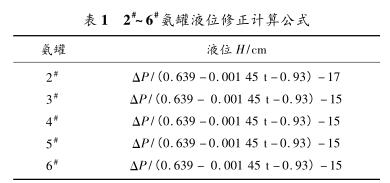 因液氨密度受溫度影響大,且每個(gè)氨罐的保溫效果也有差異,故如需準(zhǔn)確測(cè)量氨罐液位,必須引入溫度測(cè)量。對(duì)2#~6#氨罐分別進(jìn)行卸壓,并引入熱電偶遠(yuǎn)傳至DCS系統(tǒng),對(duì)密度進(jìn)行修正,修正公式為Q液=0.639-0.00145t。經(jīng)過(guò)以上修正,2#~6#氨罐液位修正計(jì)算公式如表1所示。