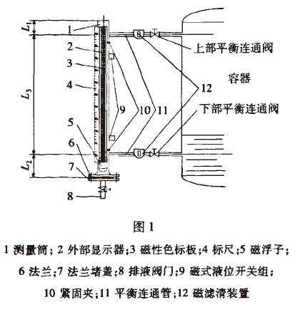 1測量筒;2外部顯示器;3磁性色標(biāo)板;4標(biāo)尺;5磁浮子;6法蘭:7法蘭堵盞;8排液閥門;9磁式液位開關(guān)組;10緊固夾;11平衡連通管;12磁濾清裝置元件上磁性材料的作用而發(fā)生翻轉(zhuǎn)。翻板或翻柱上涂有兩種視覺區(qū)分較大的顏色,觀看液位顯示器中翻板或翻柱的顏色分界線就可知容器中液位的情況。測量筒垂直方向的上下兩端安裝有閥門,其中上閥門用于平衡氣壓,下閥門用于放走殘留液體。