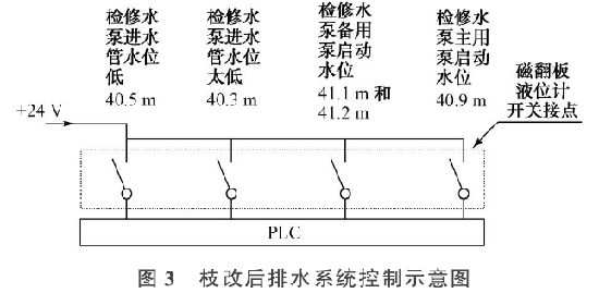它結(jié)構(gòu)是利用旁通管的原理,主導(dǎo)管內(nèi)的液位和尾水管內(nèi)的液位高度一致,根據(jù)阿基米德定理,磁性浮子在液體中產(chǎn)生的浮力和重力平衡,當(dāng)尾水管中的水位升降時,液位計(jì)主導(dǎo)管內(nèi)的浮子也隨之升降,浮子內(nèi)的永久磁鐵通過磁耦合驅(qū)動指示器內(nèi)的翻板指示器,當(dāng)液位上升或下降時,翻板指示器由白色翻轉(zhuǎn)為紅色,或由原來的紅色翻轉(zhuǎn)為白色,指示器的顏色改變的高度就是被測水位的實(shí)際高度,從而實(shí)現(xiàn)液位的現(xiàn)場指示,以供運(yùn)行人員目測尾水管的實(shí)時水位。安裝于液位計(jì)管壁外側(cè)的磁記憶開關(guān),可多點(diǎn)設(shè)置、滑動調(diào)整位置,提供了液位開關(guān)量報警功能。在裝置的頂部安裝了一個自動排氣裝置,當(dāng)主導(dǎo)管內(nèi)液位上升時能夠自動的排氣,下降時能夠按時補(bǔ)氣。現(xiàn)場安裝磁浮球液位計(jì)時,裝置標(biāo)尺的0位,對應(yīng)的實(shí)地高程為EL.40.0 m。浮子開關(guān)設(shè)定5個水位動作值,檢修水位低開關(guān)量報警值對應(yīng)的高程為40.3 m;停止所有檢修水泵的開關(guān)量,所對應(yīng)的高程為40.5 m;啟動主用檢修水泵的開關(guān)量,所對應(yīng)的高程為40.9 m;啟動檢修水泵主用泵的開關(guān)量,以及要求手動啟動大泵,并作為水位高報警上送上位機(jī),所對應(yīng)的高程為41.1 m與41.2 m,兩個開關(guān)量并列接入。全部開關(guān)量分別送入PLC,如圖3所示。
