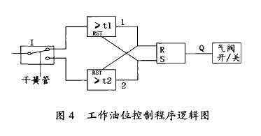 液位計(jì)筒體內(nèi)徑d/~i0mm,標(biāo)尺長(zhǎng)750mm。750mm×20%=150mm,280÷750=37.3%),液位計(jì)油位滯后于貯罐油位變化。液位計(jì)回油時(shí),浮筒漂向管口,則阻尼作用更強(qiáng)了,低油位*限開(kāi)關(guān)LB/LVL6不能及時(shí)動(dòng)作和關(guān)閉氣閥LB/EV2是造成貯油罐泄空而計(jì)算機(jī)未執(zhí)行油位故障處理程序的原因。圖3 液位計(jì)故障剖析圖3.2 液位檢測(cè)開(kāi)關(guān)和控制程序干簧管式接近開(kāi)關(guān)本身依靠磁控開(kāi)或合,易受周圍磁場(chǎng)干擾產(chǎn)生誤動(dòng)?,F(xiàn)場(chǎng)液位計(jì)安裝位置一側(cè)與電纜橋架相鄰,而另一側(cè)常有行車電磁吸盤(pán)吊裝鋼卷作業(yè)。從工作油位控制邏輯過(guò)程可以看出(圖4):盡管油位檢測(cè)開(kāi)關(guān)已通,每15s(t1=t2=15s)內(nèi),只要存在一次脈沖干擾,開(kāi)氣閥電路回路將未被選通。反之亦然。因此,干簧管式接近開(kāi)關(guān)誤動(dòng)產(chǎn)生錯(cuò)誤控制,也是釀成事故的另一個(gè)原因。
