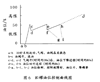 編程實(shí)現(xiàn)計(jì)算機(jī)畫(huà)面實(shí)時(shí)顯示油位(0% ~100%)和油位高、低的報(bào)警功能。我們用差壓法測(cè)量貯罐油位,如圖6所示,開(kāi)氣閥時(shí),油位回落較快;關(guān)氣閥時(shí),油位上升緩慢(每小時(shí)7%)??梢詫⒐ぷ饔臀桓呶辉O(shè)在65%,油位從該點(diǎn)升至*限高位(80%),用時(shí)估計(jì)為2h。工作油位低位在55%~60%處,預(yù)警時(shí)間將提前20s以上,工作控制油位整體提高也利于潤(rùn)滑設(shè)備的安全。因此,設(shè)定油位低于60%作為關(guān)閉氣閥條件,高于65%作為打開(kāi)氣閥條件,用雙位式調(diào)節(jié)法代替原來(lái)的延時(shí)選通位式調(diào)節(jié),控制油位在一定范圍內(nèi)。保留了原有油位故障處理程序。