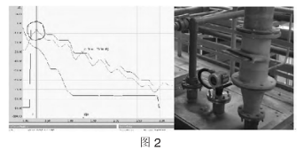 圖5為鈷礦漿化槽液位達(dá)到2.3m(量程3m)時(shí)回波包絡(luò)線圖。該液位計(jì)在投產(chǎn)初期一直正常使用,但經(jīng)過(guò)1個(gè)月后,液位發(fā)生異常波動(dòng)的情況越來(lái)越頻繁,分析回波曲線后,發(fā)現(xiàn)在較低的液位(2.3m)時(shí),回波強(qiáng)度也比較弱(30dB)。拆下液位計(jì)檢查后發(fā)現(xiàn)液位計(jì)表面附著了一層黑色的礦漿,導(dǎo)致液位計(jì)無(wú)法正常工作。