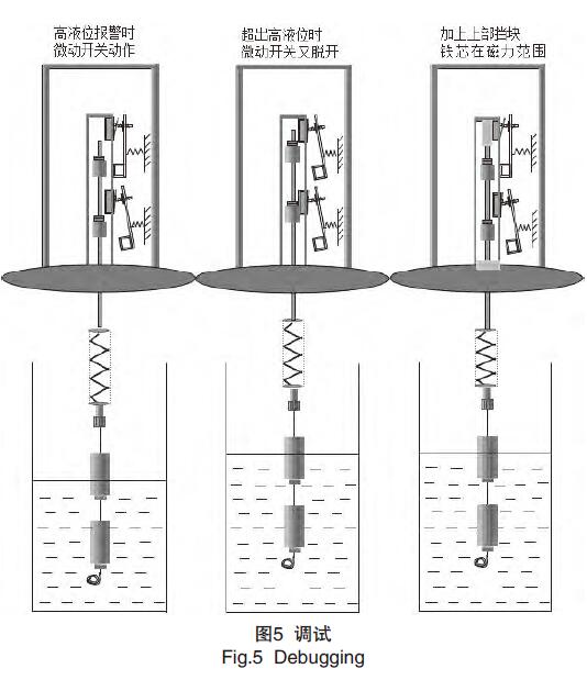 3)在調(diào)試過程中,發(fā)現(xiàn)液位開關(guān)沒有自保持功能,當(dāng)高報(bào)警點(diǎn)過后,液位再往上升則高液位報(bào)警會(huì)消除,低液位時(shí)也是同樣,在分析原因后發(fā)現(xiàn),鐵芯在套筒內(nèi)移動(dòng)的位置不當(dāng)是造成不能自保持的原因,如圖5所示,于是在套筒內(nèi)的鐵芯上方加一阻擋塊,使高液位超出時(shí),鐵芯被阻擋塊擋住,不再向上移動(dòng),從而不會(huì)脫出微動(dòng)開關(guān)的磁力范圍,對(duì)低液位報(bào)警的自保持是在鐵芯的下部加一個(gè)環(huán)型的墊片,阻止鐵芯向下移動(dòng)超出微動(dòng)開關(guān)的磁力范圍。從而提高了可靠性和重復(fù)性。接下來的調(diào)試中,又出現(xiàn)了一些零零碎碎的問題,如磁鐵磁性不夠,或者彈簧彈性不夠,彈簧的抗疲勞性差。元器件的材料和加工工藝不理想,出于對(duì)核電的安全性和穩(wěn)定性的考慮,開始考慮使用國外公司的產(chǎn)品,在試用后沒有出現(xiàn)以上的問題,于是決定從新采購一批國外的液位開關(guān),將有問題的液位開關(guān)更換成國外的產(chǎn)品。