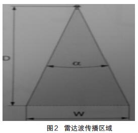 我公司有6臺硫酸儲罐,罐體間可實現(xiàn)連通,為保證測量的精度和安全性,我公司分別在6個罐體上分別安裝了雷達液位計,互為備用,并且在正常情況下還可以實現(xiàn)兩個液位測量值的準(zhǔn)確度參照比較。在安裝雷達波液位計時,剛開始采用傾斜的安裝方式,其傾斜角度不超過15°,調(diào)試液位計儀表時發(fā)現(xiàn)無物位數(shù)據(jù)顯示,分析故障原因是由于發(fā)射的雷達波到達罐體鋼板上反射回來的,其主要原因是產(chǎn)生的虛假回波干擾太大造成的。重新調(diào)整雷達液位計的安裝角度后發(fā)現(xiàn)出現(xiàn)物位數(shù)據(jù),但該數(shù)據(jù)波動很大,并且由于分析原因可能是因為液面波動對雷達波反射造成影響,基于此原因,決定在罐內(nèi)的測量筒內(nèi)安裝反射板,重新調(diào)整雷達物位計的安裝,使其雷達波的發(fā)射天線平面與反射板平行,這樣測得的物位數(shù)據(jù)比較準(zhǔn)確。反射板的面積計算:采用FMR530智能型雷達液位計,其天線尺寸參數(shù)DN80/3",波束角α=10°,雷達波傳播的區(qū)域如圖2 所示。根據(jù)公式Tan5°=W/2D,可求出W=900 mm,進而求出反射板的面積。因此我們可以制作一個直徑不小于900 mm的圓盤即可。