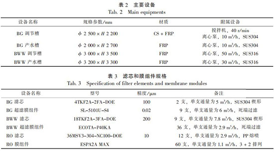超濾膜組件和反滲透膜組件前均設(shè)置保安過(guò)濾器, 濾芯和膜組件規(guī)格參數(shù)見表 3。