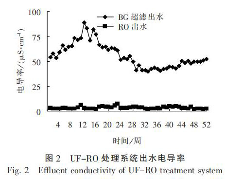 經(jīng)過(guò) 1 年的連續(xù)運(yùn)行, 晶背研磨廢水進(jìn)水 TOC質(zhì)量濃度為 0.5 ~ 5.0 mg / L, 濁度為 80 ~ 100 NTU,SiO2 質(zhì) 量 濃 度 為 2 ~ 4 mg / L, 反 洗 廢 水 進(jìn) 水 TOC質(zhì) 量 濃 度 為 1.5 ~ 3.0 mg / L, 濁 度 為 4 ~ 8 NTU,UF-RO 處理出水 TOC 質(zhì)量濃度低于 1 mg / L, 濁度低于 0.1 mg / L, SiO2 質(zhì) 量 濃 度 低 于 1 mg / L, 完 全可以回用至超純水預(yù)處理系統(tǒng)。 UF-RO 處理系統(tǒng)出水電導(dǎo)率和 TOC 濃度見圖 2 ~ 圖 3。