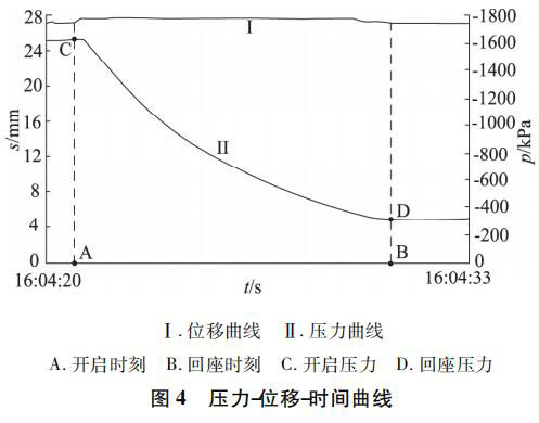 運用安全閥冷態(tài)試驗裝置對該磁翻板液位計進行動作性能試驗,將試驗容器內的介質壓力卸放到整定壓力以下,開啟試驗容器和安全閥進口端的球閥,關閉流量計管路閥門,開啟主測試管路截止閥,開啟儲氣容器通向試驗容器的節(jié)流閥,逐漸加壓,同時啟動計算機數(shù)據(jù)采集系統(tǒng),被試安全閥開啟,繼續(xù)升高壓力,直至被試安全閥保持全開啟( 排放) 狀態(tài),然后關閉儲氣容器通向試驗容器的閥門,被試安全閥亦逐漸關閉。計算機自動生成試驗過程的壓力、位移曲線,試驗人員記錄采集開啟壓力、排放壓力、回座壓力、開啟高度等數(shù)據(jù)。重復上述試驗至少 3 次,得到相應壓力-位移-時間曲線,見圖 4。左縱坐標為位置,右縱坐標為壓力,其中上部曲線代表導閥位移,下部曲線代表壓力變化。當導閥位置發(fā)生變化,代表導閥開始開啟動作,此時的壓力為該磁翻板液位計的開啟壓力,即整定壓力; 當導閥位置回到原點代表導閥已經(jīng)回座,此時對應的壓力即為回座壓力。