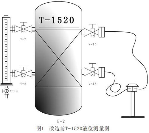原T-1520液位測量為下圖1所示,左側(cè)為電遠傳磁翻板液位計,右側(cè)為雙法蘭磁性浮子液位計。