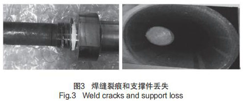 在歷次大修執(zhí)行 GSS 系統(tǒng) MSR 熱水箱液位計(jì)預(yù)防性維修檢查時(shí)發(fā)現(xiàn),部分導(dǎo)波桿支撐件破碎并丟失,同時(shí)存在探桿根部焊縫有裂痕的問(wèn)題,見(jiàn)圖 3 焊縫裂痕和支撐件丟失。