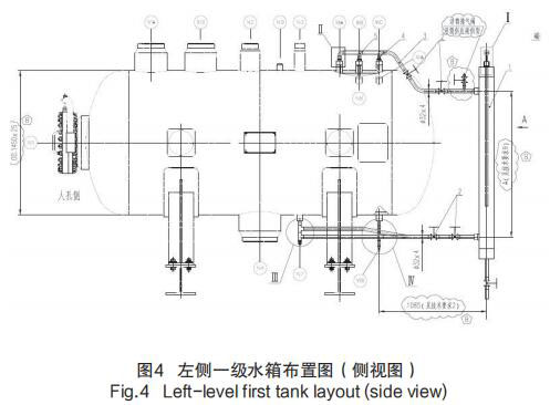 1)在每個(gè)疏水箱外部靠近水側(cè)取壓口處,安裝 3 個(gè)測(cè)量筒用于導(dǎo)波熱水箱液位計(jì)的安置以及液位測(cè)量;每個(gè)測(cè)量筒的汽側(cè)取壓口仍然選用原導(dǎo)波熱水箱液位計(jì)接口,而水側(cè)取壓口引用原水汽取樣口、磁翻板液位計(jì)取壓口,以左側(cè)一級(jí)水箱布置圖為例,見(jiàn)圖 4 左側(cè)一級(jí)水箱布置圖(側(cè)視圖)。