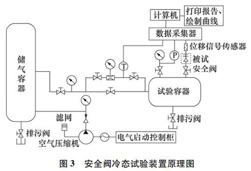 安全閥冷態(tài)試驗裝置( 見圖 3) 主要由壓縮氣源、儲氣罐、節(jié)流控制閥、試驗罐、閥門和管道、數(shù)據(jù)采集系統(tǒng)、控制系統(tǒng)等組成,可對公稱壓力 PN≤20 MPa,公稱通徑 DN≤150 mm 的安全閥進(jìn)行整定壓力試驗、排放壓力試驗、回座壓力試驗、開啟高度試驗、排量及排量系數(shù)試驗,檢測參數(shù)和自動化程度達(dá)到國內(nèi)**水平。