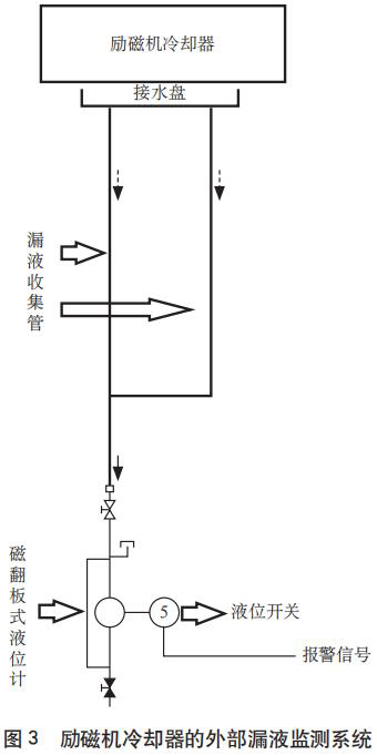 實(shí)際運(yùn)行經(jīng)驗(yàn)表明,防凍液位計(jì)內(nèi)部銅管發(fā)生泄漏的概率較低,但一旦發(fā)生泄漏,漏液會(huì)隨著冷卻空氣沿閉合風(fēng)路進(jìn)入勵(lì)磁機(jī)內(nèi)部,造成勵(lì)磁機(jī)短路損壞的嚴(yán)重后果。為了保證機(jī)組安全,應(yīng)有冷卻器內(nèi)部銅管泄漏監(jiān)測(cè)裝置,然而現(xiàn)場(chǎng)沒(méi)有配置此類(lèi)裝置。