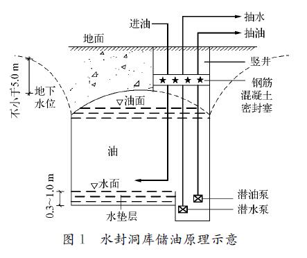 1.1 儲油原理水封洞庫通過人工在地下巖石中開挖形成,其密封是通過地下水向洞內(nèi)滲透實現(xiàn),即水封洞庫必須建在穩(wěn)定的地下水位線以下一定的深度,洞罐的埋深與洞室儲存介質(zhì)的*大工作壓力、工程地質(zhì)和水文地質(zhì)條件、穩(wěn)定的地下水位等因素有關(guān),其埋深應(yīng)保證洞庫周圍的地下水壓力大于洞內(nèi)儲存介質(zhì)的壓力。正常儲存時,洞外部地下水壓力大于洞內(nèi)介質(zhì)壓力,地下水只能向洞內(nèi)滲透,而洞內(nèi)介質(zhì)不能向洞外滲漏,同時利用油比水密度小以及油水不能混溶的特點,滲入洞內(nèi)的水沿洞壁匯集到洞底部形成水墊層,從而達到將所儲介質(zhì)封在洞內(nèi)的目的。滲入洞內(nèi)的水可由油水界面檢測儀表進行檢測,待達到一定高度時,用安裝在洞內(nèi)的潛水泵將水排出洞外。水封洞庫儲油方法有固定水位法和變動水位法,采用變動水位法儲油新鮮水的需求量和污水處理量大,運行費用高,因而目前多采用固定水位法,儲油原理示意如圖1所示。