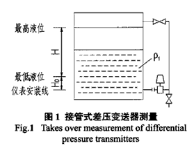 圖1中,ρ1為介質密度,Ho為液位起始點。差壓變送器與液體導管為水平安裝,只要確定氣相管內無冷凝液,當液位密度穩(wěn)定時,即可準確測量液體的高度。但在液氨儲罐的液位測量過程中,氣相管內的氣氨會隨環(huán)境瘟度的變化而冷凝,產(chǎn)生壓差,故這種接管式的差壓測量方法不適用于液氮儲罐的測量。
